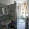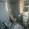 Bad mit Dusche, Waschbecken, Bidet, WC und Waschmaschine.