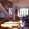 1.Etage:Wohnzimmer mit Kamin, Esstisch, Schlafcouch und Stuhle. Wohnkueche mit Esstisch, Spuelmaschine, Gasherd, Mikrowelle, Kuehlschrank.