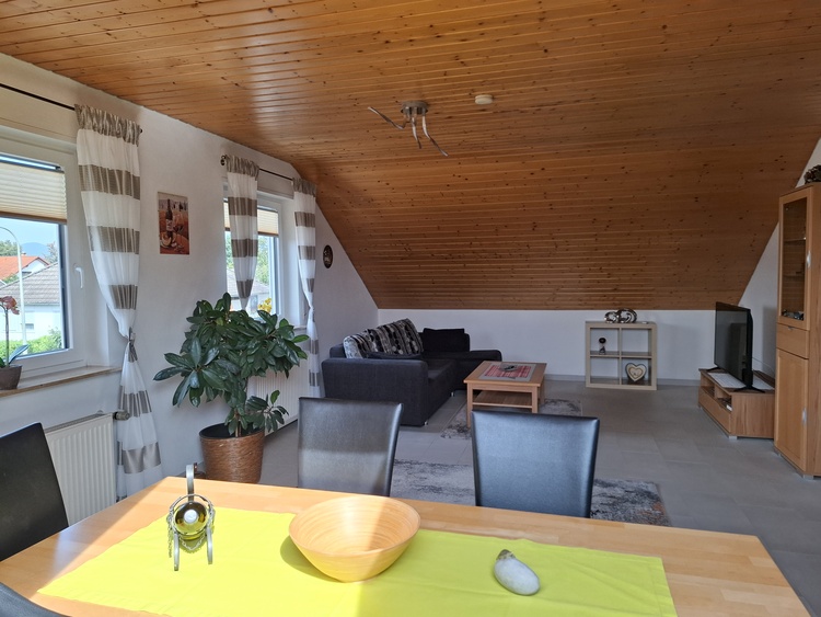 Die großzügige Nichtraucher-Ferienwohnung befindet sich im Dachgeschoss eines 2-Familienhauses. Mit ihren 95 qm bietet Sie genügend Platz für 4 Personen. Die Ferienwohnung verfügt über 2 Schlafräume (1 Doppelbett, 2 Einzelbetten), 1 neu renoviertes Bad mit Dusche und Waschmaschine, 1 komplett eingerichtete Einbauküche sowie 1 Wohnzimmer mit Blick auf das Hambacher Schloss. Die Wohnung wurde 2021 renoviert und liebevoll eingerichtet. Alle Räume sind entweder mit Laminat- oder Fliesenboden ausgestattet. Die großen Dachfenster besitzen elektrische Rollläden. Zu der Ferienwohnung gehört ein gemütlicher Freisitz im Garten, ein Autostellplatz, sowie ein Schuppen für Ihre Fahrräder.