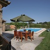 Eine große überdachte Terrasse mit Tisch und Stühlen befindet sich vor dem Ferienhaus, so wie der gemauerte Außengrill und der gepflegte Swimmingpool mit Rasenfläche und Sonnenliegen.