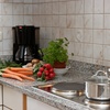 Elektroherd, Kühlschrank, Tiefkühlfach, Geschirrspüler, Geschirreinrichtung, Wasserkocher, Kaffeemaschine, Toaster, Besteck, Gläser