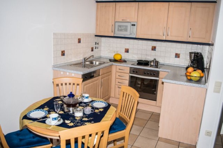 Sie verfügt über ein Wohnzimmer mit Essplatz, SAT-TV, DVD-Player, Stereo-Anlage (mit CD-Player), kostenlosem WLAN-Internetzugang und einer modern ausgestatteten Küchenzeile (Elektroherd mit Backofen, Mikrowelle, Kühlschrank mit 3-Sterne-Gefrierfach, Geschirrspüler, Kaffeemaschine, Kaffeepadmaschine, Wasserkocher), ein Schlafzimmer, Badezimmer mit Dusche und einen überdachten Südbalkon. Die Wohnung ist durchgehend gefliest. Keine Haustiere.