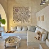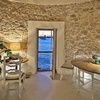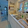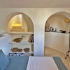 Oberhalb des Wohnraums befindet sich die voll ausgestattete Küche und davor gelagert eine Theke mit Speisebereich fuer schnelle Mahlzeiten. Entlang des Flurs, der am kleinen Platz endet, gibt es ein Badezimmer mit Dusche fuer das Turmzimmer und weiter das Doppelbettzimmer mit einem großen Badezimmer, beide mit fantastischem Meerblick.