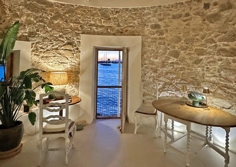 Die Wohnung besteht aus einem großen doppelten Wohnraum mit Speisebereich und einem fantastischen Blick über das das Meer, und die gesamte Strandpromenade von Marciana Marina, sowie hoch zu den Bergstädten Poggio und Marciana alta. Von dem Wohnzimmer im Turm, mit seinen antiken Steinen, gelangt man über eine moderne von der Designerin entworfene Wendeltreppe in den unteren Turmbereich, in dem sich ein Schlafzimmer mit Doppelbett befindet.