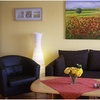 Geräumiges Wohnzimmer mit einer Eckpolstergarnitur, die zur Schlafcouch ausgezogen werden kann, Ledersessel, Couchtisch und moderner Wohnzimmerschrank, LCD Sat-Farb-TV, DVD-Player, Radio mit CD-Player, Bücher, Spiele.