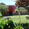 Von außen ist das Haus mit einer roten Holzverkleidung versehen.