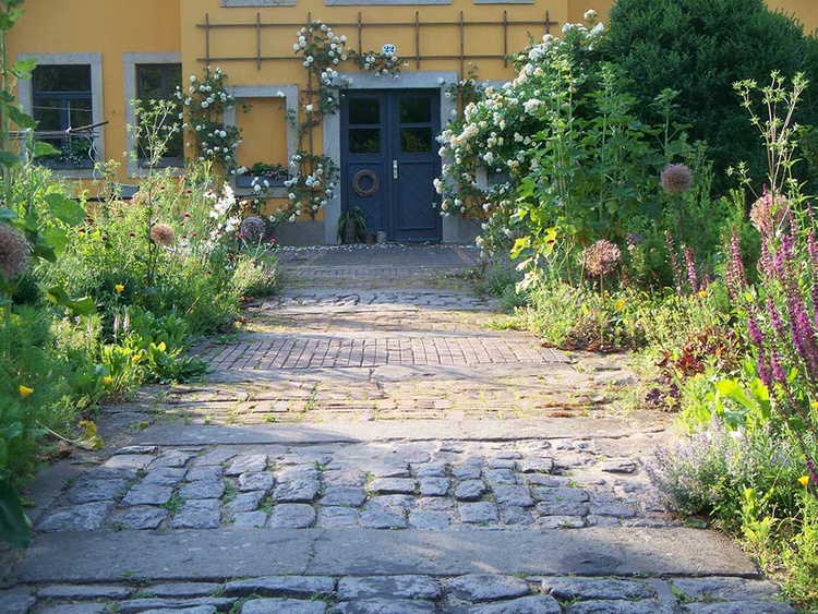 Besonders eindrücklich ist die Kombination unseres schönen alten Hauses mit dem Garten: Der etwa 800 qm große Garten orientiert sich an romantischen Landhausgärten, ist jedoch wie ein Barockgarten formal auf das Haus bezogen. Die einzelnen Bereiche, getrennt durch Hauptweg und Querallee, teilen sich Frühlingsgehölze, englische Rosen, ein Küchengarten, Kräuterbeete und einjährige Pflanzen. Hinter dem Haus leitet der terrassierte „Beerenzwinger“ zu weiteren Gartenzimmern und dem Ferienwohnungsgarten über.