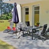 18qm Südterrasse mit Gartenmöbeln und Sonnenliegen.