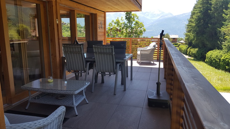 grosse Terrasse zum Geniessen und Verweilen. Mit Tisch, Stühlen und Liegestühlen, Lounge etc
