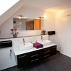 Integriert im Wohn- und Essbereich befinden sich in zwei Ebenen, der Ausblick ins Grüne ist hiermit auch aus dem rückwärtigen Teil des Gebäudes möglich und durch die großzügigen Eckfenster wird der Blick in die Natur ermöglicht. Große Holzterrassen erweitern den Wohnraum in den Außenbereich.