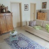 Helles, sonniges Wohnzimmer mit weiterer Schlafcouch, Essecke und Leseecke.