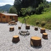Richtiges Kinder-Holzgitterbett (70x140cm) und Kinderhochstuhl, etc. für die Kleinen und Grill- und Lagerfeuerstelle mit Picknickbank für die Großen.