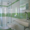 Modernes Badezimmer mit Dusche erhöhten WC und Waschbecken.