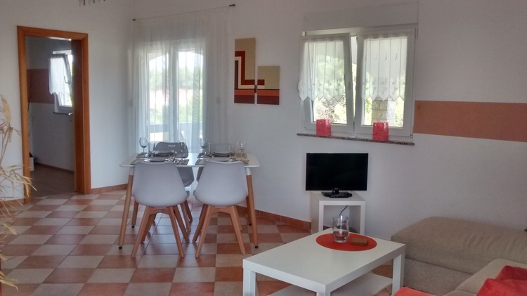 die beiden 50 qm großen Apartments mit jeweils 17 qm großer überdachter Terrasse, befinden sich in der 1. Etage und sind über separate Außentreppen und eigenem Eingang erreichbar. Jedes Apartment verfügt über ein großes Wohnzimmer mit hochwertiger, volleingerichteter offener Küche mit Cerankochfeld, Geschirrspülmaschine, Kühlschrank und Mikrowelle. Klimaanlage, Sat-TV + Musikanlage mit CD-Player, moderner Couch mit Ottomane, ausziehbar zu einem bequemen 2x2 m großem Bett, einem Schlafzimmer mit Doppelbett und großem Schrank und einem Bad mit Dusche. Extras wie Bettwäsche und Handtücher, Terrassenmöbel und Roll-Liege mit Auflagen, Fön, Bügeleisen und Bügelbrett, Wäscheständer, Staubsauger, Bücher und Spiele, sind vorhanden. die Apartments sind geeignet für 2-3 Personen, sie haben ein klein wenig seitlichen Meerblick und einen tollen Blick auf das Velebitgebirge.