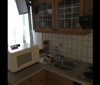 Elektroherd, Kühlschrank, Tiefkühlfach, Mikrowelle, Geschirreinrichtung, Wasserkocher, Kaffeemaschine, Toaster, Besteck, Gläser