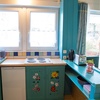 Der Küchenbereich besizt eine Spüle, einen 4-Plattenherd und Kühlschrank, und wird von Kaffeemaschine, Wasserkocher und Toaster ergänzt.