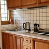 Elektroherd, Kühlschrank, Tiefkühlfach, Geschirreinrichtung, Wasserkocher, Kaffeemaschine, Toaster, Besteck, Gläser