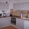 > Küche komplett eingerichtet mit Geschirr, Sitzmöglichkeiten und Kaffeemaschine, Toaster, Mikrowelle, Wasserkocher, Brotschneider, Herd mit Ceranfeld und Backofen, Geschirrspüler, Kühlschrank