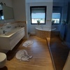 1 Badezimmer mit zwei Keramikwaschbecken und Waschtischunterschränken sowie einen kleinen Unterschrank , eine Acryl-Eckbadewanne, wandhängendes Tiefspül-WC mit Absenkautomatik, Duschanlage mit Spritzschutz SGL 8 mm/1400 x 2000 mm , Waschmaschine sowie elektrische Fußbodenheizung.
