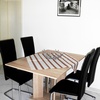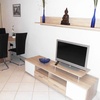 Im harmonisch eingerichteten Wohnzimmer mit offener Küche befindet sich ebenfalls ein großes Ecksofa mit Schlaffunktion, sowie eine Esstischgruppe. Auf dem Sideboard befindet sich ein 32 Zoll Flachbild-Fernseher sowie der Wlan-Zugang in der gesamten Wohnung. Ein WLAN-Netz zum einwählen ist in der Wohnung vorhanden.