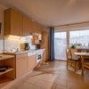Im Wohnzimmer befindet sich eine Küchenzeile mit ausreichen Kochutensilien und Geschirr.