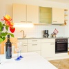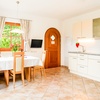 Unsere Ferienwohnung im Erdgeschoss mit 40m2 besteht aus einer großen Wohn-Küche mit gemütlicher Essecke, Flachbild Sat-TV und einer ausziehbaren Doppelbettcouch. Die Küchenzeile verfügt über 4 Ceran-Kochfelder, Backrohr, Kühl- und Gefrierschrank, Kaffeemaschine, Dunstabzugshaube, Geschirr, Geschirrtücher.