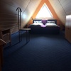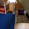 Das Kleine Ferienhäuschen ist in Ober- und Untergeschoss aufgeteilt. Über eine Treppe erreichen sie den Schlafbereich. Hier finden sie ein Doppelbett und zwei Kinderbetten.