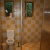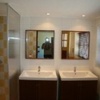 -The modern, spacious bathroom has two sinks, a large shower and a toilet.
