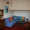 Downstairs in the cozy living room is a spacious seating area and a dining table.