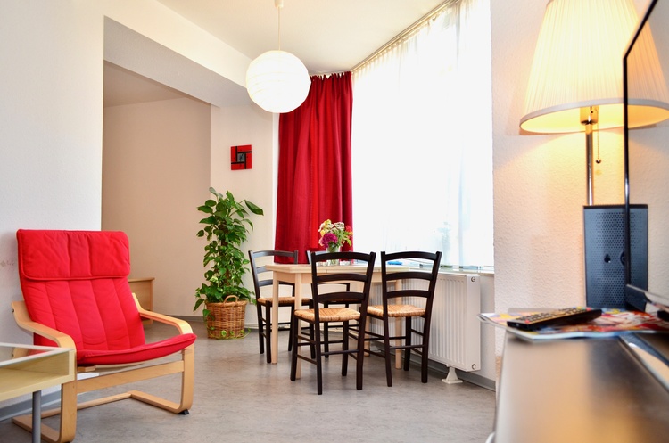 Die Wohnung Universität ist eine großzügig geschnittene 1-Zimmerwohnung auf 53qm, mit Küche, Bad, Schlaf-Wohnzimmer mit Eßtisch und TV.