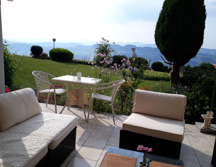Unser Haus liegt am Stadtrand von Lindenberg im Allgäu mit Blick in eines der schönsten Alpenpanoramas im Allgäu. Die Allgäuerberge, die Berge von Österreich und der Schweiz, genießen Sie direkt von unserer Sonnenterrasse. Tische/Stühle/Liegestühle stehen für Sie im Garten bereit.