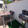 Im vorderen Terrassenbereich stehen bereit: 6 Sonnenliegen, Tisch, Stühle, Holzkohlegrill und Sonnenschirm. Markise direkt an der Terrasse vor dem Wohnzimmer.