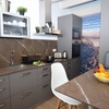 Moderne und komplett eingerichtete Einbauküche (Kühl-Gefrierkombination, Ceranherd, Abzugshaube, Backofen, Mikrowelle, Spülmaschine, Nespresso-Kapselmaschine und Filterkaffeemaschine, Toaster, Wasserkocher, sämtliches Geschirr etc.) mit integrierter Waschmaschine und kleiner Theke mit Barhockern.