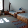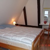 Im Obergeschoss liegen zwei Schlafzimmer, das weiß geflieste Bad mit seiner Schmetterlingsgaube und eine kleine "Leseecke" im Mittelgiebel. Die Schlafzimmer sind mit Teppichboden ausgelegt. Das eine der beiden Zimmer kann auf Wunsch mit drei normal großen Betten oder mit zwei Betten und einem Babybett ausgestattet werden. Aus den Schlafzimmern genießen Sie den Blick über den Garten mit dem Birnbaum ins Dorf.