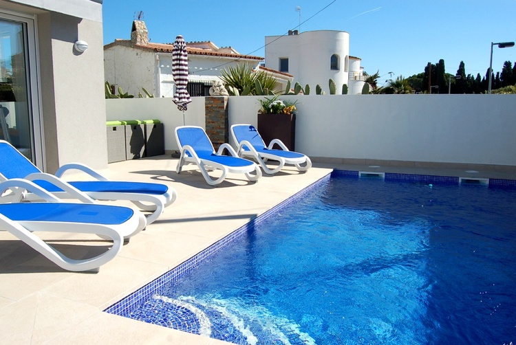 Herrliche Neubau-Villa Pool auf 2 Etagen mit 150 qm Wohnfläche für bis zu 6 Personen in zentraler und ruhiger Lage nur 600 m zum Strand in Requesens. Internet (W-Lan), Zentral-Klima/Heizung in allen Räumen, modernste Einbauküche, 3 Schlafzimmer, 3 Bäder, TOP Ausstattung !