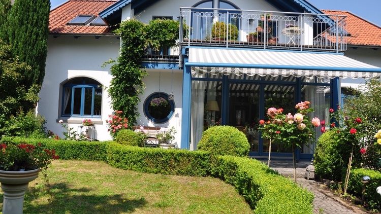 Der mit Gartenmöbeln ausgestattete große Balkon sowie der prächtig bepflanzte Garten mit Pavillion laden zum Verweilen und Entspannen ein. Ein Parkplatz mit abschließbarem Tor sowie eine Unterstellgelegenheit für Ihre Fahrräder und Sportgeräte in unserer Remise sind vorhanden.