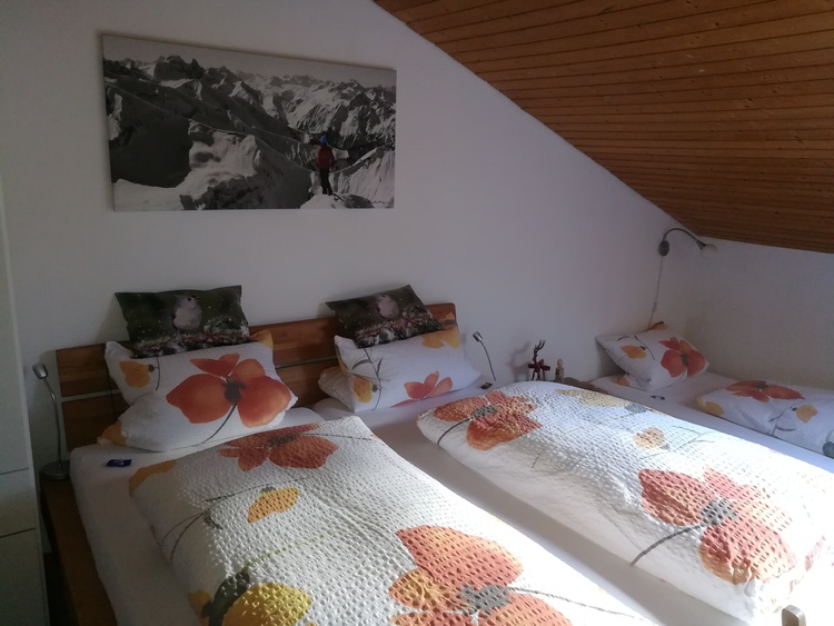 36m2 , 1 Doppelbett und 2 Einzelbetten, gemütliche ausziehbare Schlafcouch, Essecke für bis zu 4 Personen Flachbildfernseher , Bücher , Großer Schrank für Ihre Utensilien, Spiegelkommode, Radio mit CD-Spieler und Safe , Bettwäsche und Handtücher, Geschirr ,Kleine Kochnische mit Kühlschrank, Mikrowelle, 2-Plattenherd, Kaffemaschine, Wasserkocher,Geschirr, Besteck, Gläser und Töpfe Garderobe, Schuhablage, Müllentsorgung, Leihschirm Ihr separates Bad besitzt eine Dusche, WC und Waschbecken. Durch das Dachfenster haben Sie einen Blick auf den Hausberg von Immenstadt, den Mittagberg und das Immenstädter Horn. Zertifizierter BETT and BIKE Betrieb! Kleines Frühstück oder großes Frühstück gegen Aufpreis! ! Kleiner Hund willkommen (Preis auf Anfrage )