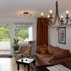 Das Wohnzimmer ist mit einer hochwertigen Couch versehen und bietet den Gästen einen Zugang auf den Südbalkon mit Blick auf das Nahe-Ufer und den Rheingrafenstein. Die Essecke im Wohnbereich ist mit Massivholzmöbeln im mediterranen Stil eingerichtet.Der Balkon ist ausgestattet mit einer Lounge-Sitzgruppe sowie Sonnenliegen. Im Essbereich stehen der Smart-TV, die DUAL-Stereo-Anlage mit CD-Player und Bluetooth und der DVD-Blue-Ray-Player auf einem Sideboard, in dem das Essgeschirr sowie Gläser für mindestens sechs Gäste untergebracht sind.