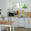 Elektroherd, Kühlschrank, Tiefkühlfach, Geschirreinrichtung, Wasserkocher, Kaffeemaschine, Toaster, Besteck, Gläser