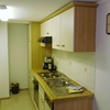 Küchenzeile mit kleinen Backofen, Spülmaschine, Kühlschrank und Kaffeemaschine.