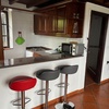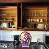 Gasherd, Kühlschrank, Mikrowelle, Geschirreinrichtung, Wasserkocher, Kaffeemaschine, Toaster, Besteck, Gläser