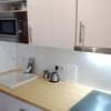 Elektroherd, Kühlschrank, Tiefkühlfach, Mikrowelle, Geschirreinrichtung, Wasserkocher, Besteck, Gläser