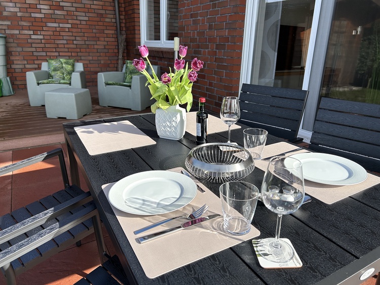 In der komplett ausgestatteten Küche befindet sich der Essbereich mit 4 Stühlen und einem Esstisch. Von dort gelangen Sie auf eine kleinere Terrasse. Dort können Sie prima den ersten Kaffee oder Tee des Tages genießen.