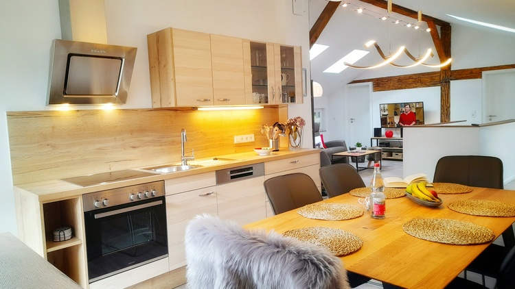 Elektroherd, Kühlschrank, Tiefkühlfach, Geschirrspüler, Wasserkocher, Kaffeemaschine, Toaster, Eierkocher, Besteck, Gläser