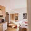Geräumiges Zwei-Raum-Apartment mit getrenntem Doppelzimmer, ruhigen Balkon mit Sitzgelegenheit, Küchenzeile mit Esstisch, Doppelschlafcouch, Wäscheständer, Bad mit Dusche, Wellnesstasche mit kuscheligem Bademantel und Kosmetikprodukten