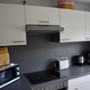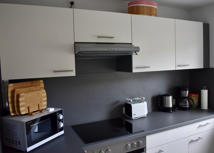Elektroherd, Kühlschrank, Tiefkühlfach, Geschirrspüler, Mikrowelle, Geschirreinrichtung, Wasserkocher, Kaffeemaschine, Toaster, Besteck, Gläser
