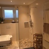 Großzügiges Badezimmer mit barrierefreier Dusche, WC, Waschmaschiene, Fön, Seifenspender und Handtuchtrockner