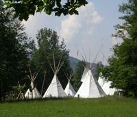 Unser Indianer-Hotel bietet 16 gemütlich eingerichtete Tipi-Zelte in einem malerischen Tal, umgeben von zwei Bächen u. einem kleinen Badeteich, nur zwei Gehminuten von unserem hofeigenen Bauernladen entfernt. Jede Familie oder Gruppe hat ihr eigenes Tipi, das mit einem befestigten Untergrund u. Holzliegen ausgestattet ist. Feuerstellen im u. um das Tipi ermöglichen ein geselliges Grillen mit Holz.