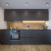 Elektroherd, Kühlschrank, Tiefkühlfach, Geschirrspüler, Geschirreinrichtung, Wasserkocher, Kaffeemaschine, Toaster, Besteck, Gläser
