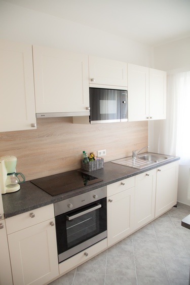 Elektroherd, Kühlschrank, Tiefkühlfach, Geschirrspüler, Mikrowelle, Geschirreinrichtung, Wasserkocher, Kaffeemaschine, Besteck, Gläser